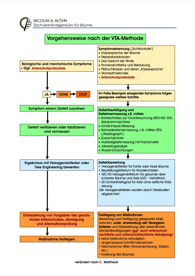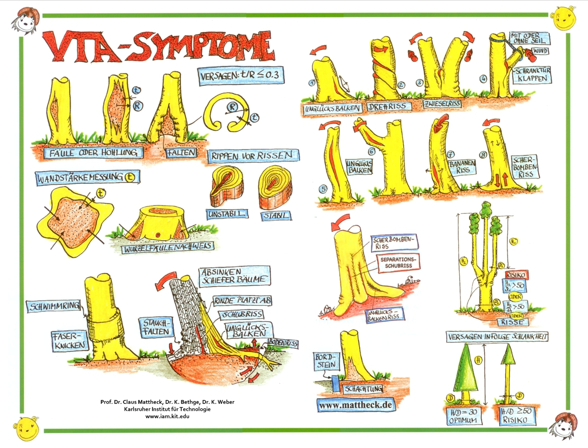 Ein fachlich und rechtlich bewährtes Verfahren zur Bewertung der Stand- und Bruchsicherheit von Bäumen ist die Visual Tree Assessment (VTA)-Methode. Sie umschließt eine visuelle Beurteilung mit Hilfe eines Katalogs von Symptomen, ggf. auch Versagenskriterien und wird im Bedarfsfall ergänzt durch weitere Messverfahren, die im folgenden kurz beschrieben werden.