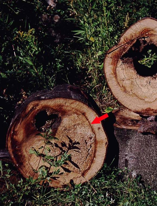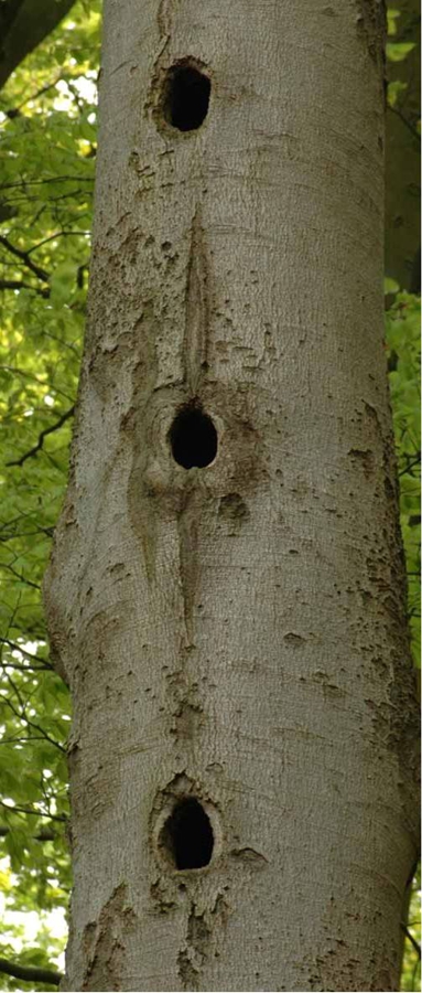 Sobald an Stämmen mit Spechthöhlen zusätzliche Risssymptome, wie z.B. zwischen den Höhlungsöffnungen oder in der Nähe der ausgehöhlten Bereiche, erkennbar sind, ist größte Vorsicht geboten, da es sich um Querrisse im kritisch ausgehöhlten Stammquerschnitt handeln könnte.