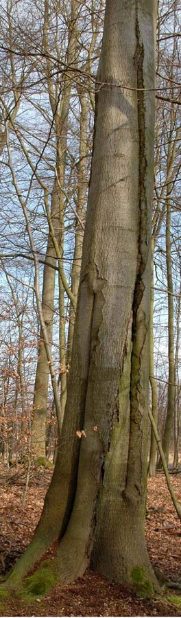 Wie andere Habitatstrukturen zeichnen sich Risse durch verschiedene Ausprägungen und Alterungsstufen aus. Die Rotbuche links zeigt Dreh- und Schubrisse, die sich durch Pilzeintritt zu einer bis zum Erdboden reichenden Mulmhöhle entwickelt haben. Man beachte die recht effiziente Stabilisierung durch massive Anbauten von Reaktionsholz. Der "arbeitende" Riss in der Eiche rechts im Bild erzwingt ebenfalls Abwehr- bzw. Kompensationsreaktionen des Stammes. Bei frischeren Rissen bzw. bei ständigem Neuaufbruch von Überwallungsversuchen treten Saft- und Schleimflüsse auf als Speziallebensräume für diverse Tiere und andere Organismen, wie z.B. Schwebfliegen und Wildhefen.