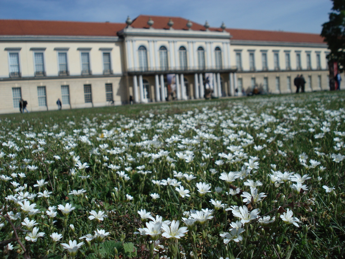 Die Wiesen des Schlossgartens Charlottenburg wurden im Rahmen eines vegetationskundlichen Gutachtens1 sowie eines studentischen Projektes2 und einer Diplomarbeit3 an der TU Berlin untersucht. Sie sind geprägt durch das Vorkommen von Zeigern alter Gartenkultur wie Nickender Milchstern (Ornithogalum nutans), Hohler Lerchensporn (Corydalis cava) und Sibirischer Blaustern (Scilla siberica). Auffallende Blühaspekte werden gesetzt durch Scharfer Hahnenfuß (Ranunculus acris), Wiesen-Margerite (Leucanthemum vulgare) und Wiesen-Storchschnabel (Geranium pratense). Goldhafer (Trisetum flavescens) und Aufrechte Trespe (Bromus erectus) stellen typische Grassamenankömmlinge aus dem 19. Jh. dar. Die Rasenflächen zeichnen sich durch einen enormen Artenreichtum aus. Auf nährstoffarmen Substraten wachsen dort konkurrenzschwache und seltene Arten wie Graues Fingerkraut (Potentilla incana) oder Knollen-Hahnenfuß (Ranunculus bulbosus).