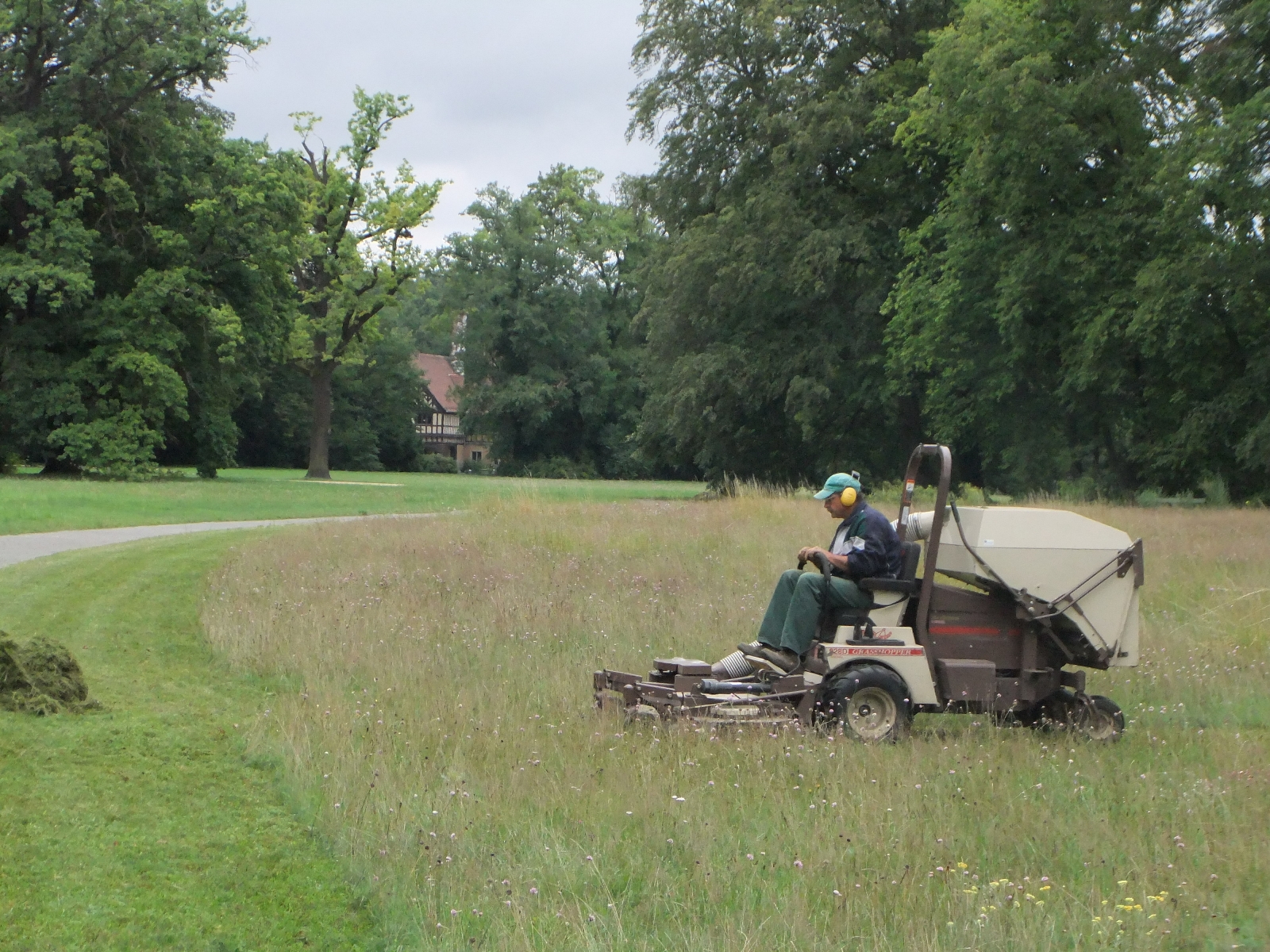 Im Neuen Garten Potsdam wurde mit einem Saugmulchgerät Saatgut artenreicher Magerrasen gewonnen und auf die Tochterfläche aufgebracht.
