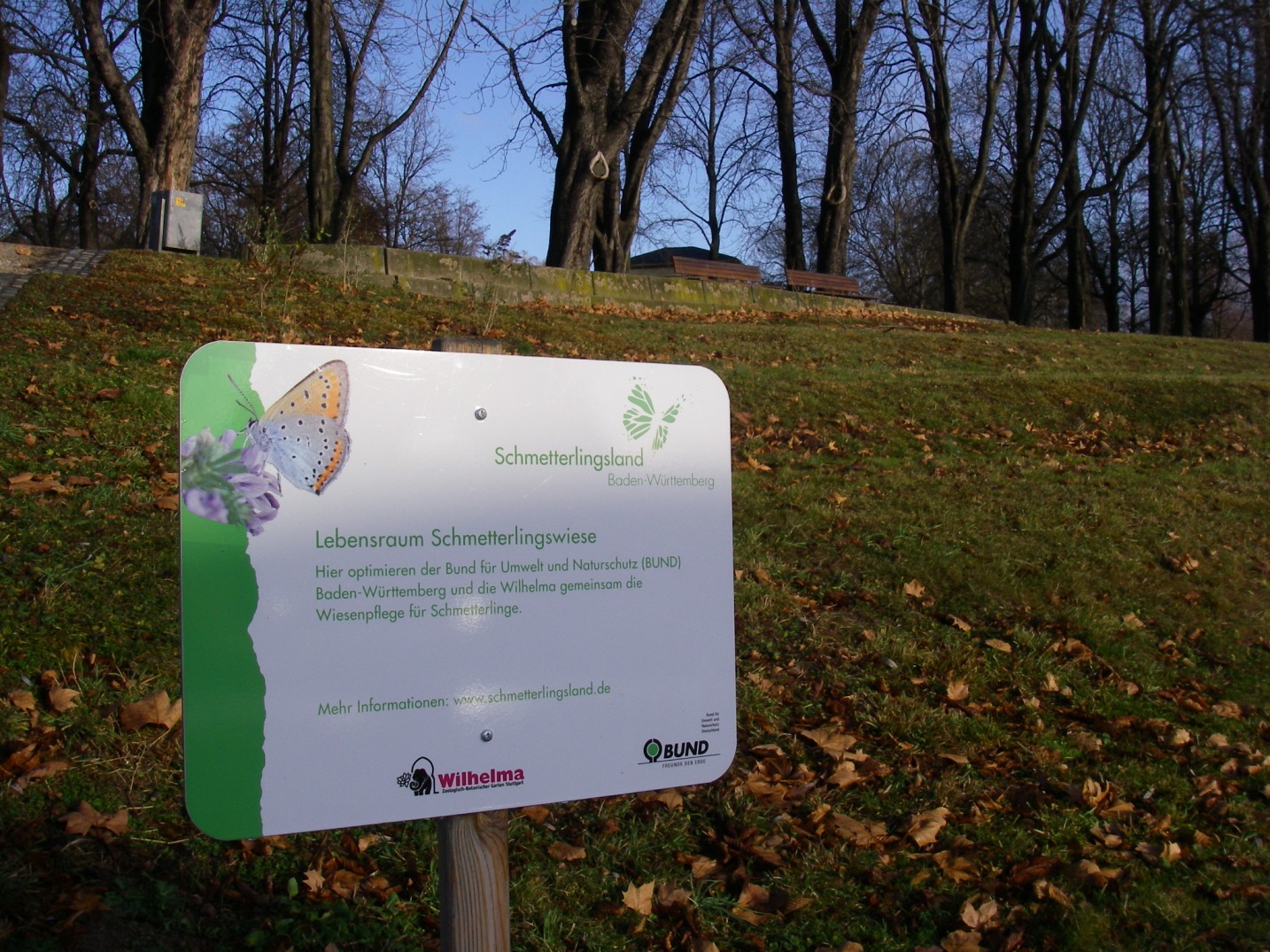 Optimierung der Wiesenbewirtschaftung unter Berücksichtigung der Betriebsabläufe und des Artenschutzes (v. a. in Hinblick auf den Lebensraum von Schmetterlingen): Pressearbeit, Informationsschild, Internetauftritt, Initialansaaten, Mahdoptimierung, Einbeziehen von Mitarbeitern der Parkpflege in die Maßnahmenfestlegung.
