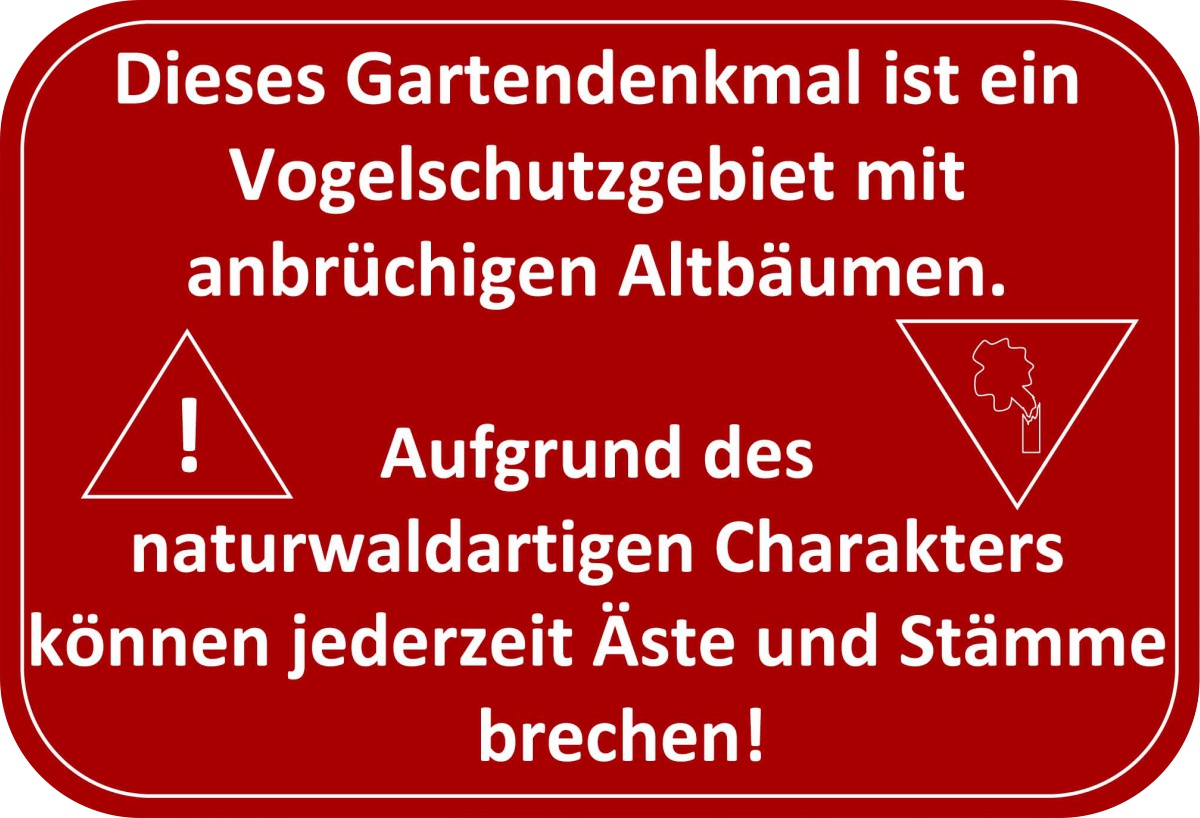 - Auf die besonderen Gefahren sollte sicherheitshalber durch entsprechende Warnschilder hingewiesen werden. Dies ist bei Naturschutzgebieten im Wald oder in Naturwaldreservaten üblich und ist deshalb erst Recht in Parkanlagen zu empfehlen, da dort die Verkehrserwartung besteht, einigermaßen sicher vor herabfallenden Ästen usw. zu sein. Warnschilder führen zwar nicht zu einer Haftungsbefreiung, können aber ggf. ein Mitverschulden des Geschädigten begründen.